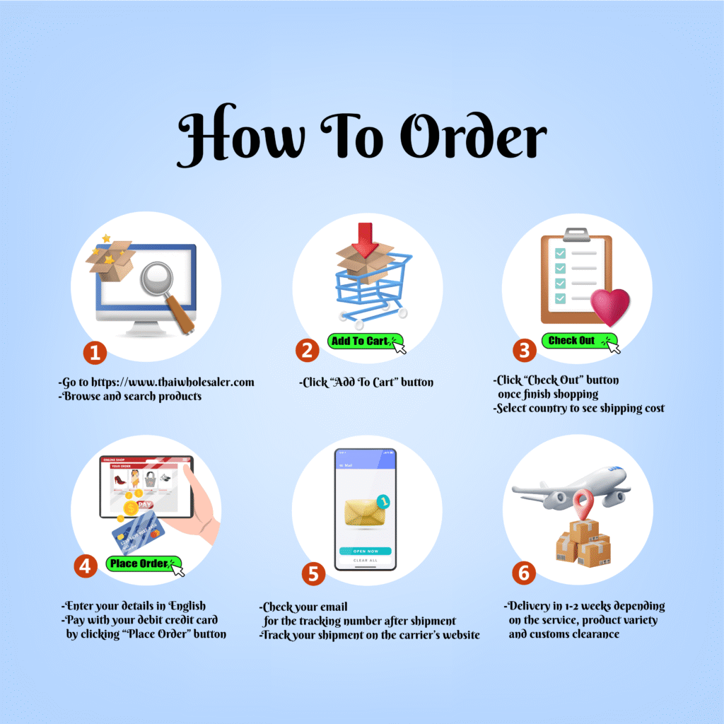 In most cases, no special documents are required for delivery. However, depending on your country’s customs regulations, you may be asked to provide identification, a tax ID, or import-related documents. Please note that ThaiWholesaler.com is unable to assist with additional documentation, and orders cannot be refunded.