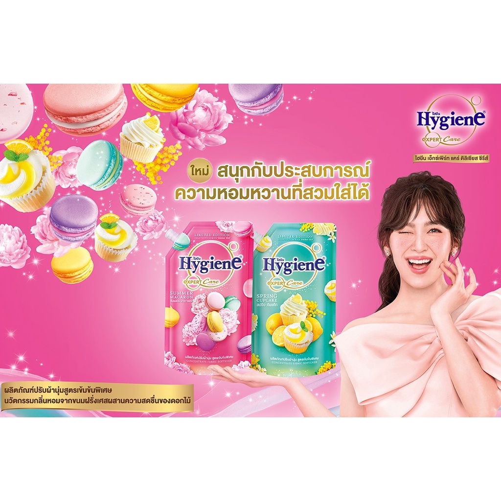 The first time a special concentrated fabric softener product comes with Delicious Scent Technology, the most innovative innovation that changes the taste of sweets into fragrance. Specially created as Hygiene Expert Care Delicious Series, a fragrance that combines the science of taste and smell together. Until you smell the aroma that is alluring and delicious. Summer Macaron scent: Summer Macaron, is a scent inspired by the taste of macarons. Unique French desserts Experience the gentle aroma of sweet almond cream combined with sweet and fruity tea. amid the fresh, fragrant atmosphere of the flower garden