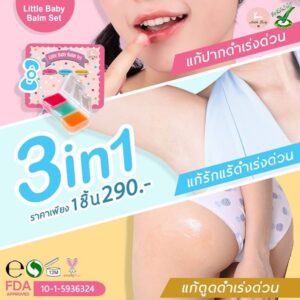 Little Baby Balm Set is a 3-in-1 skincare set designed for lip and targeted body care. The set includes Lip Macaron Lip Balm, Underarm Balm, and Topping Balm Plus for specific areas. Formulated to help improve the appearance of uneven skin tone and dryness.