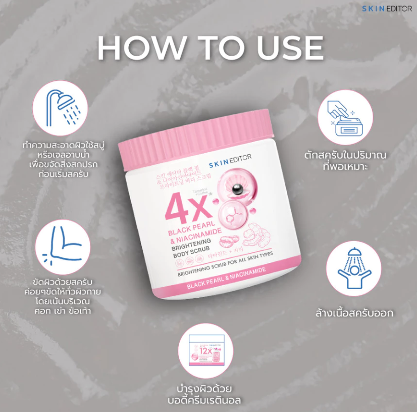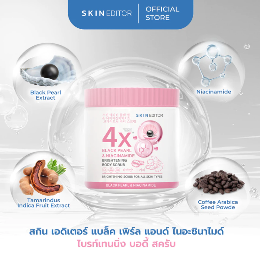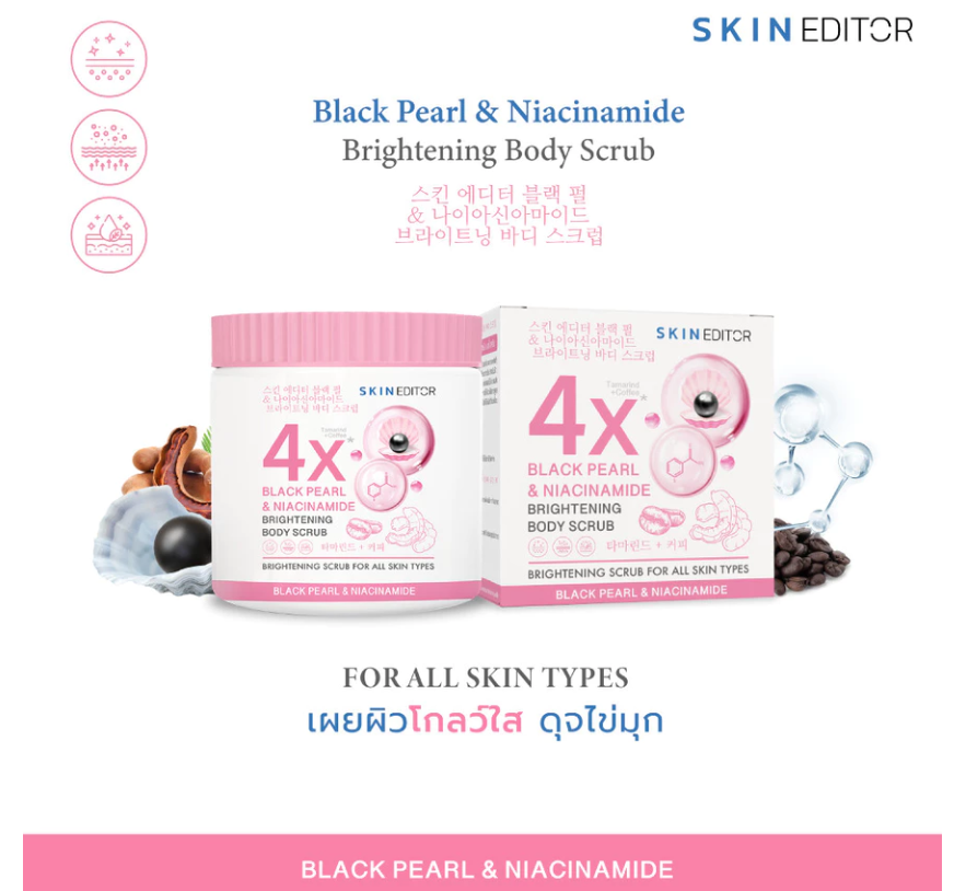 Skin Editor Black Pearl & Niacinamide Brightening Body Scrub is a fine-textured exfoliating body scrub designed to gently remove dead skin cells while helping improve the appearance of dull and uneven skin.