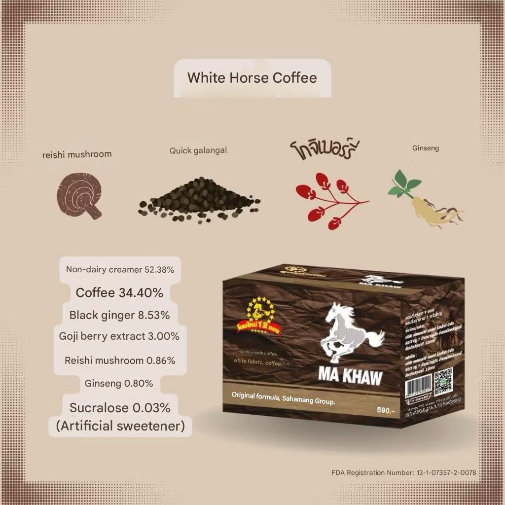 White Horse Ma Khaw Coffee is a rich and flavorful herbal coffee blend designed to complement an active lifestyle.